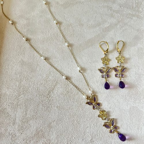 A graceful butterfly jewellery set designed in 925 sterling silver, featuring an amethyst drop necklace paired with delicate rice pearls and golden chain accents. The set includes a matching necklace, bracelet, and earrings for a refined, coordinated look.