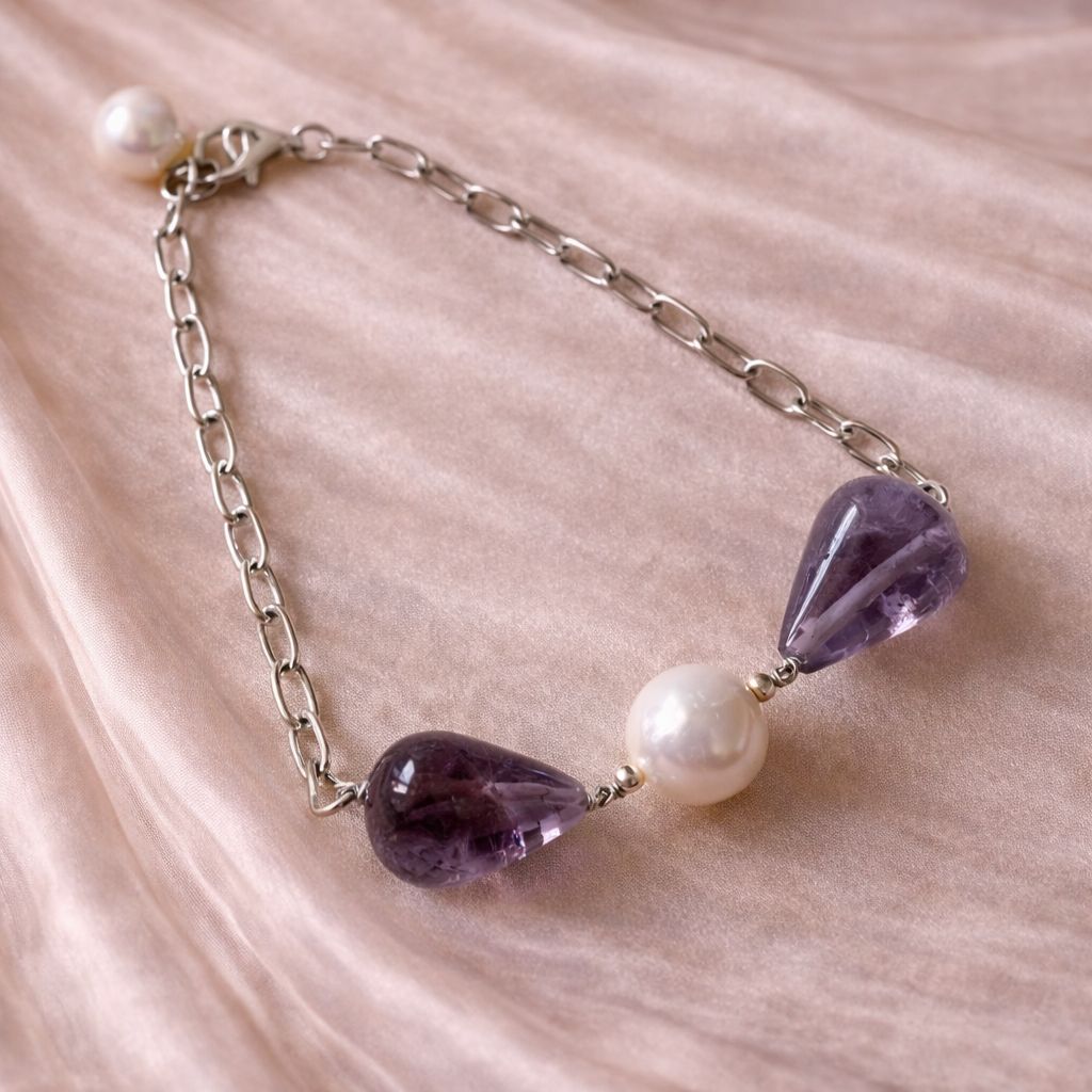 A delicate amethyst drop bracelet designed with two amethyst drops, a freshwater pearl centre, and a sleek 925 silver chain. Adjustable and lightweight, this bracelet adds effortless elegance to every look.