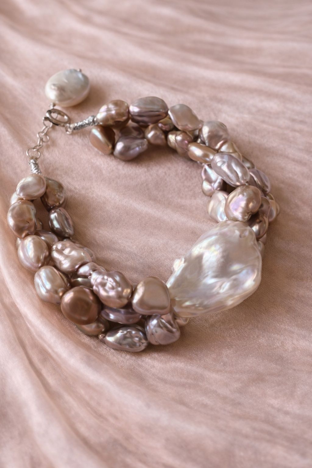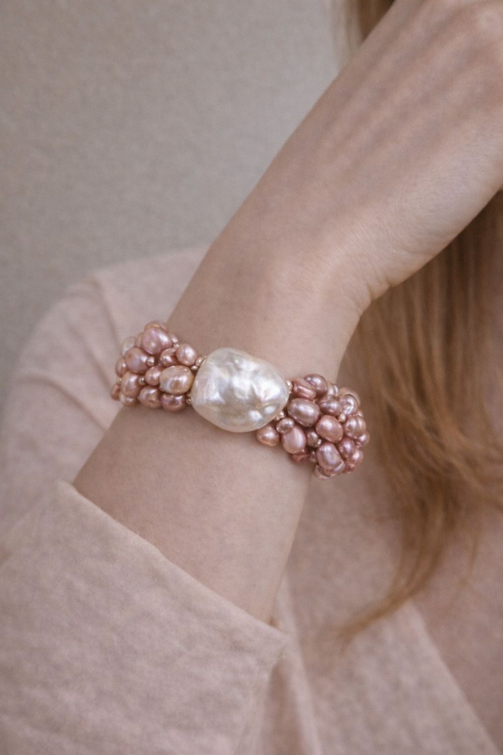 A delicate baroque pearl bracelet crafted with a centre baroque pearl, surrounded by pinkish-peach pearl chips and finished with a coin pearl charm. Soft, feminine, and effortlessly elegant for everyday luxury.