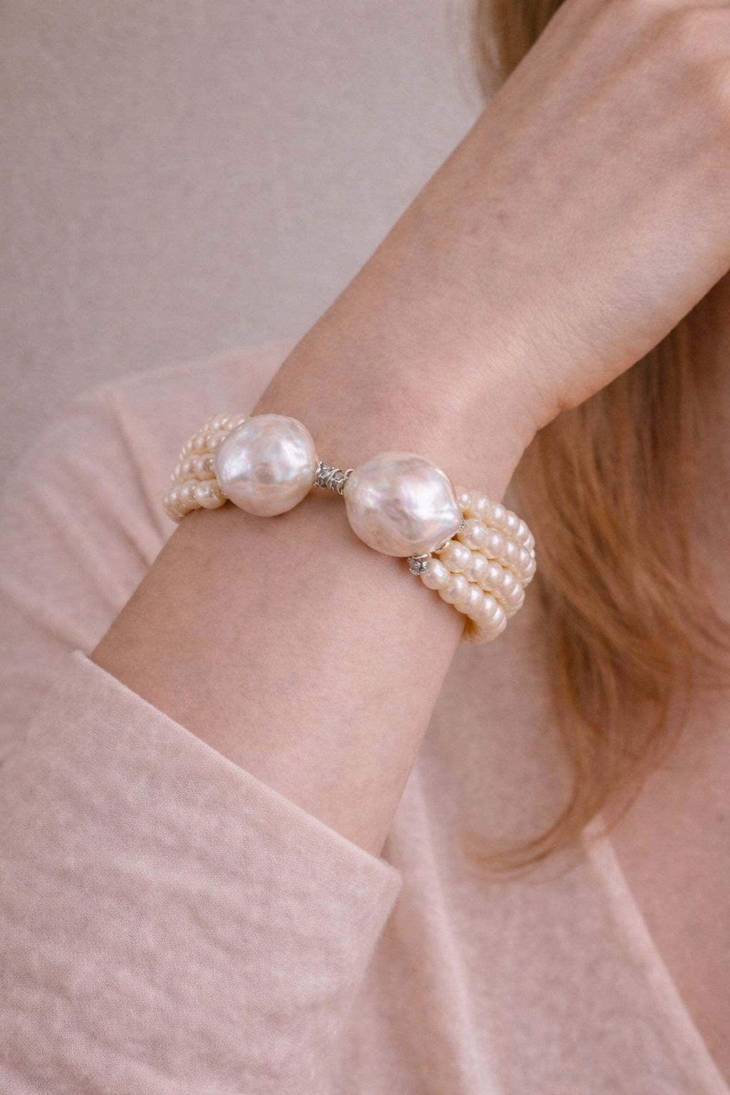 A timeless baroque pearl bracelet designed with two centre baroque pearls, button pearl links, and a delicate coin pearl charm. Soft, elegant, and handcrafted for effortless everyday luxury.