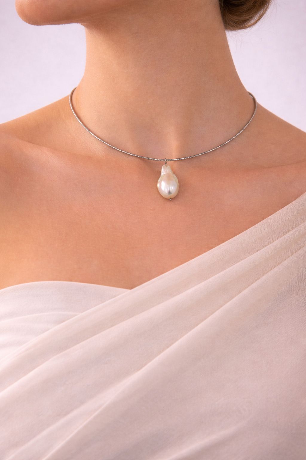 A minimal yet striking 14-inch Husli necklace crafted in 925 sterling silver, finished with a single natural baroque pearl drop for an elegant statement look..