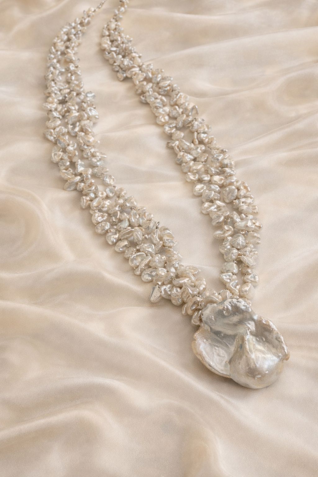 A handcrafted multi-string freshwater pearl chip necklace featuring a statement baroque pearl at the centre, finished with an adjustable cream-golden dori for a custom fit.