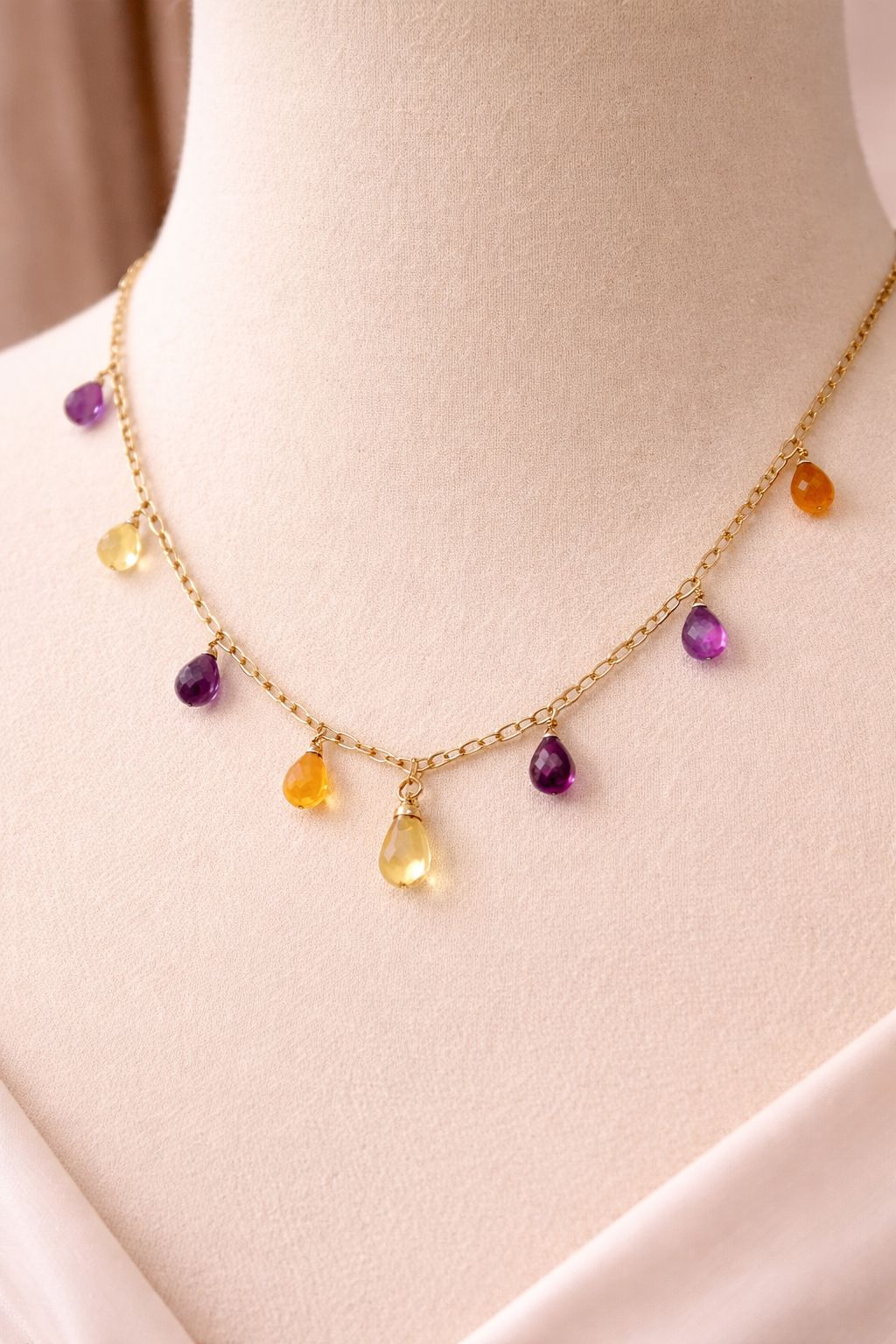 Delicate Drops: The gemstones are presented as delicate drops, adding a touch of movement and elegance to the necklace. (Specify the size and cut of the drops if possible – e.g., “4mm faceted citrine and amethyst drops”).