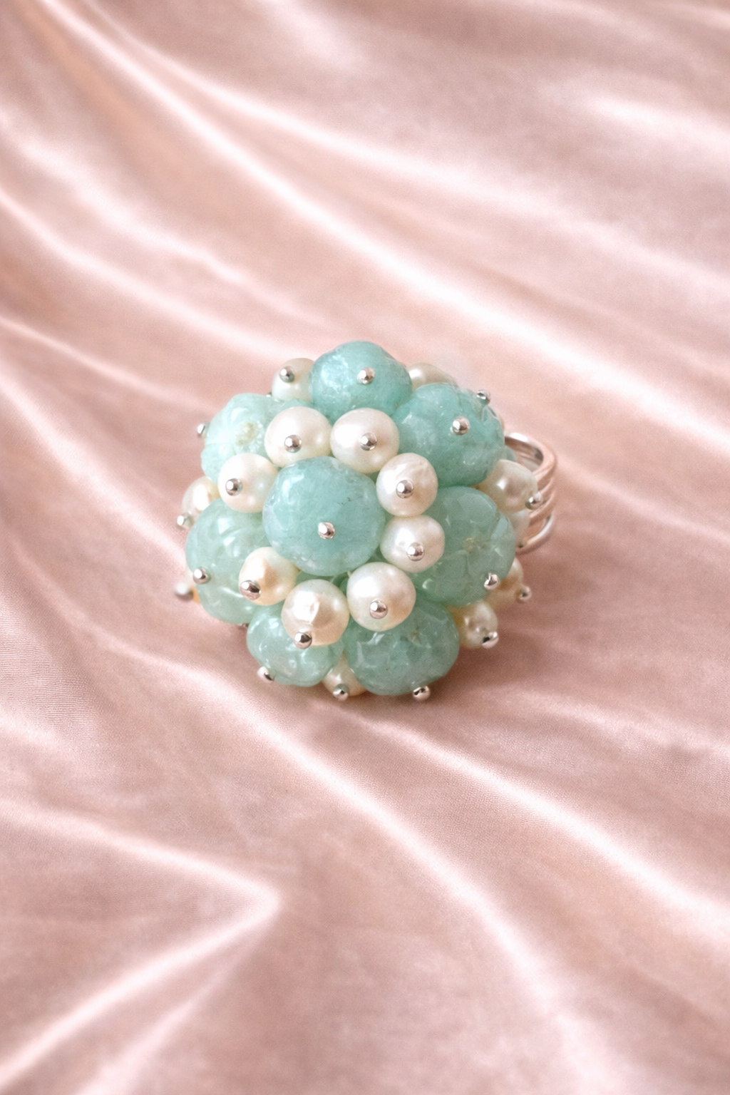 This Fluorite Melon Ring is a captivating blend of vibrant color and playful design. The ring features a unique melon-shaped Fluorite stone, known for its mesmerizing range of colors and association with focus and clarity. This striking stone is beautifully complemented by a delicate Mother of Pearl (MOP) accent, adding a touch of subtle shimmer and ethereal beauty.