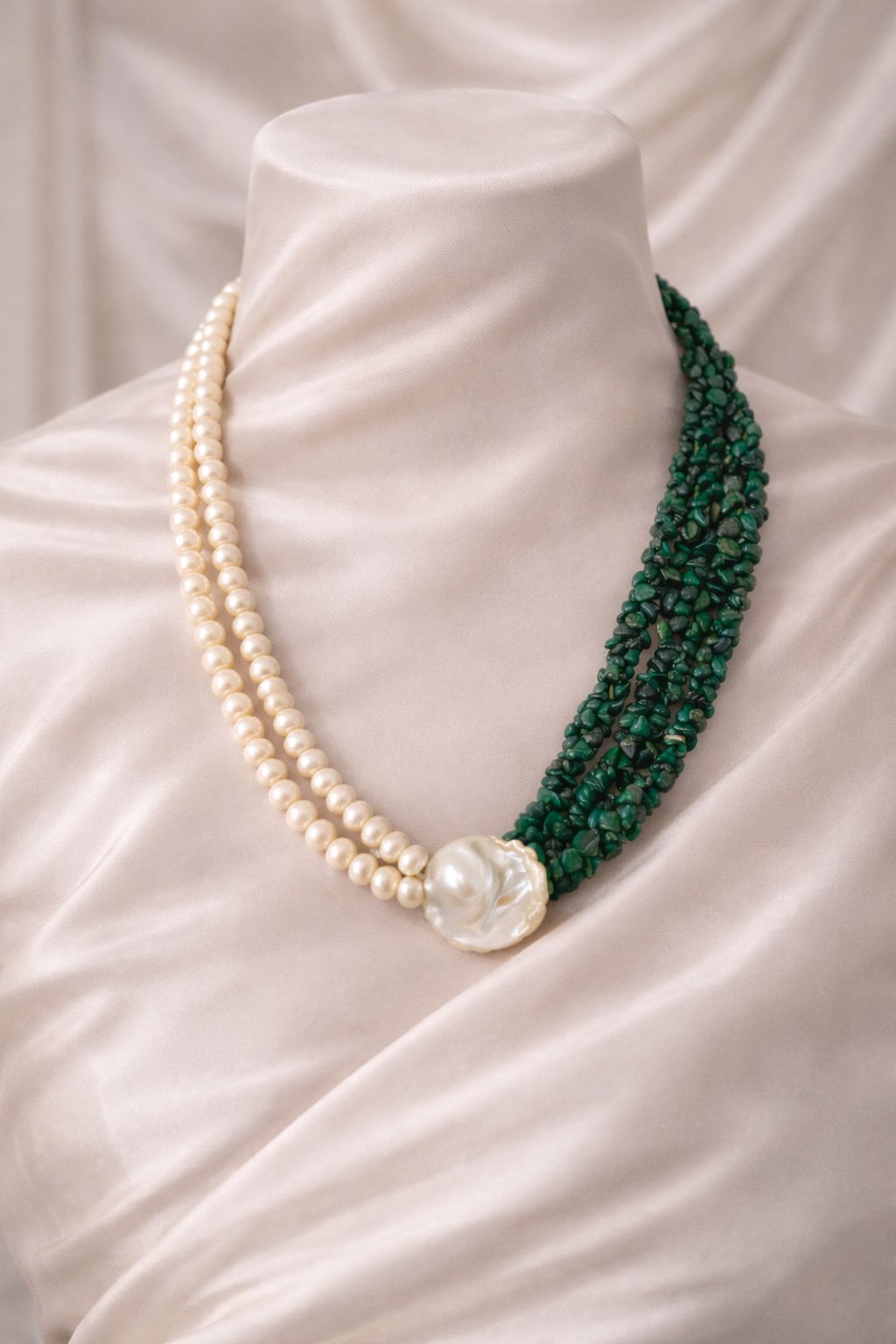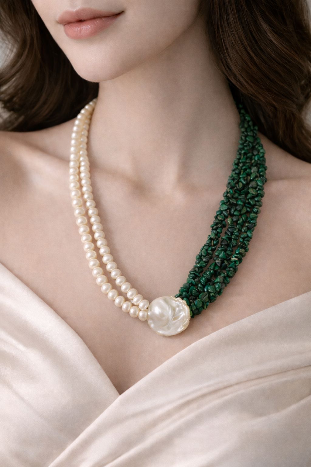 A statement of balance and beauty — this Freshwater Pearl & Malachite Chip Dori Necklace features an elegant contrast of one side pearls and one side malachite chips, beautifully joined in the center with a baroque pearl. Designed in an adjustable dori style, it’s perfect for both everyday luxury and occasion styling.