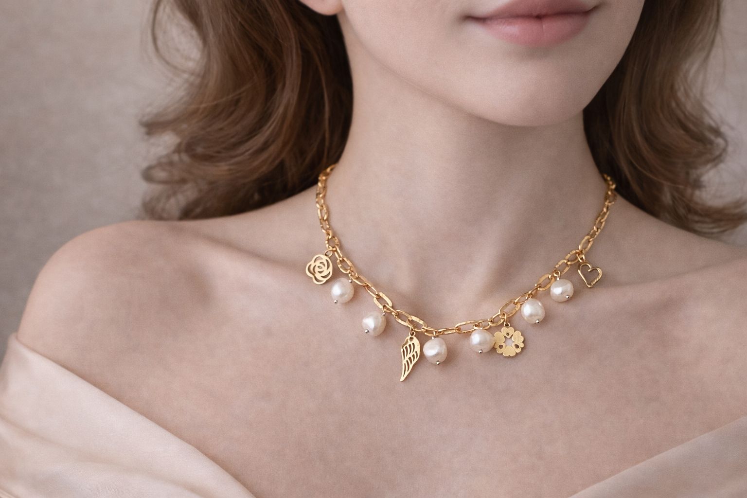A luxurious 925 sterling silver chain finished in 1 micron gold plating, beautifully detailed with freshwater pearl hangings and elegant charm motifs like a flower, angel wing, and heart. This 18-inch statement piece is delicate, meaningful, and perfect for everyday luxe styling.