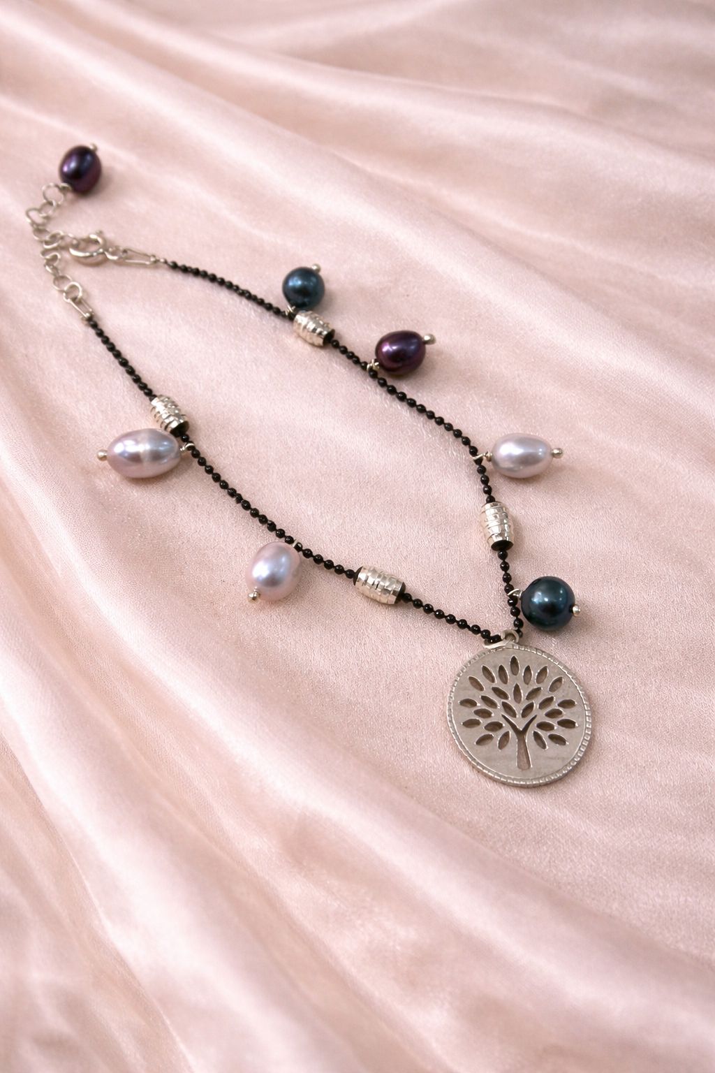 A sleek Italian black chain bracelet designed with grey and black pearl droppers and finished with a silver tree charm. Crafted in 925 sterling silver with an adjustable 6–7 inch fit, this bracelet adds effortless elegance and meaning to everyday looks.