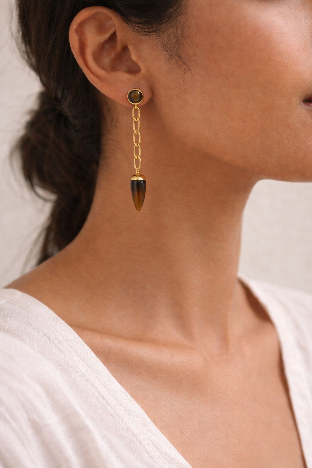 • Finished with a cone-shaped tiger eye drop for a statement look