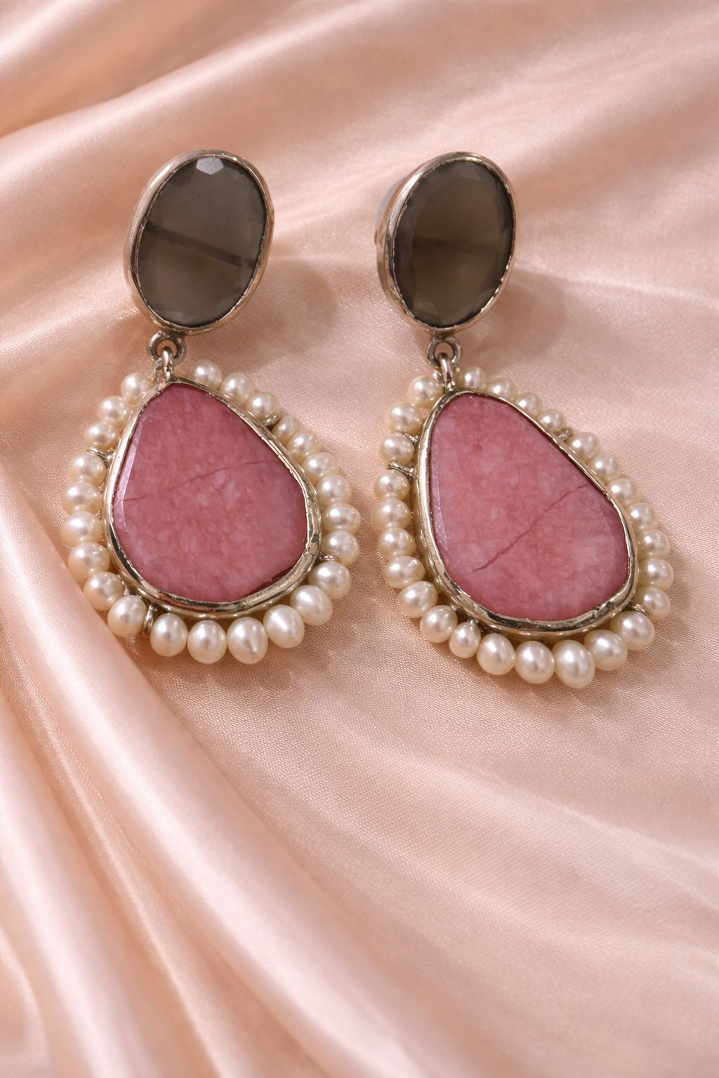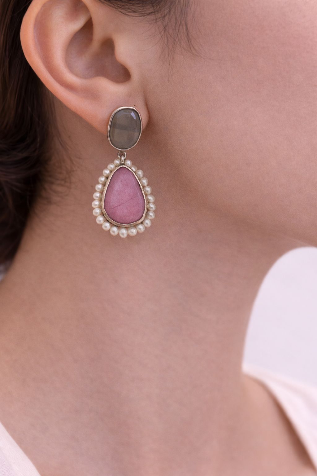 A graceful pair of moonstone and pink opal earrings crafted in 925 sterling silver. Featuring an oval moonstone and a pear-shaped pink opal framed with 3 mm pearls, these earrings bring soft luxury and timeless charm to every look.