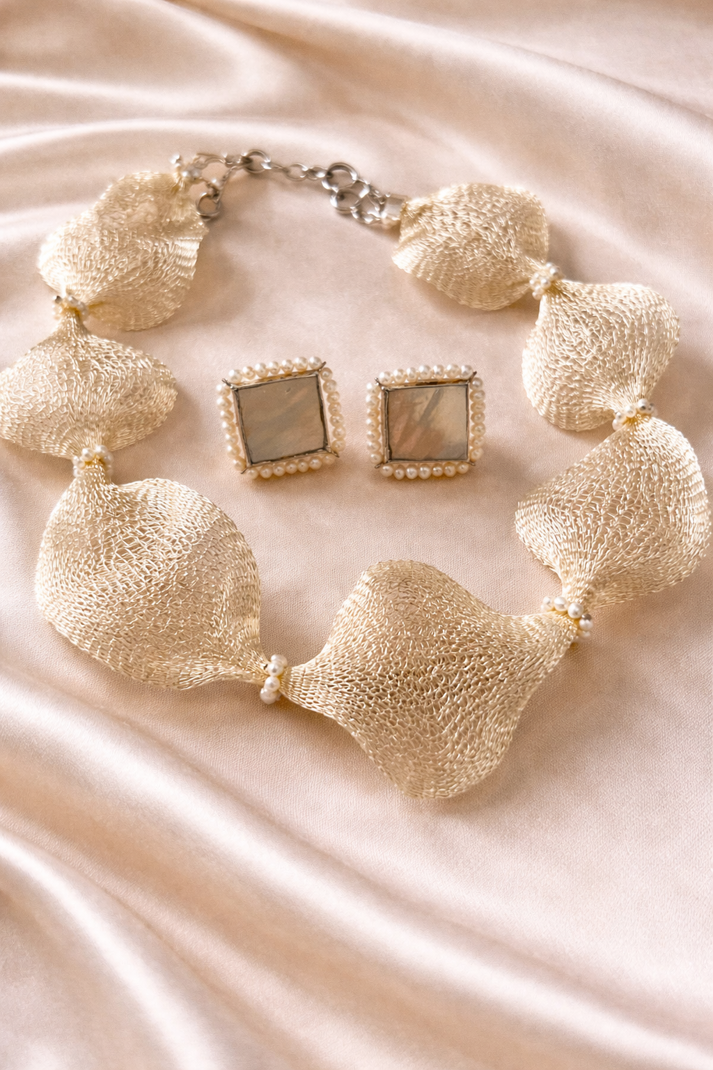 Matching Earrings: The set includes coordinating earrings that complement the choker, offering a complete and cohesive look. “Matching stud earrings feature smaller mother-of-pearl accents set within a delicate silver mesh.