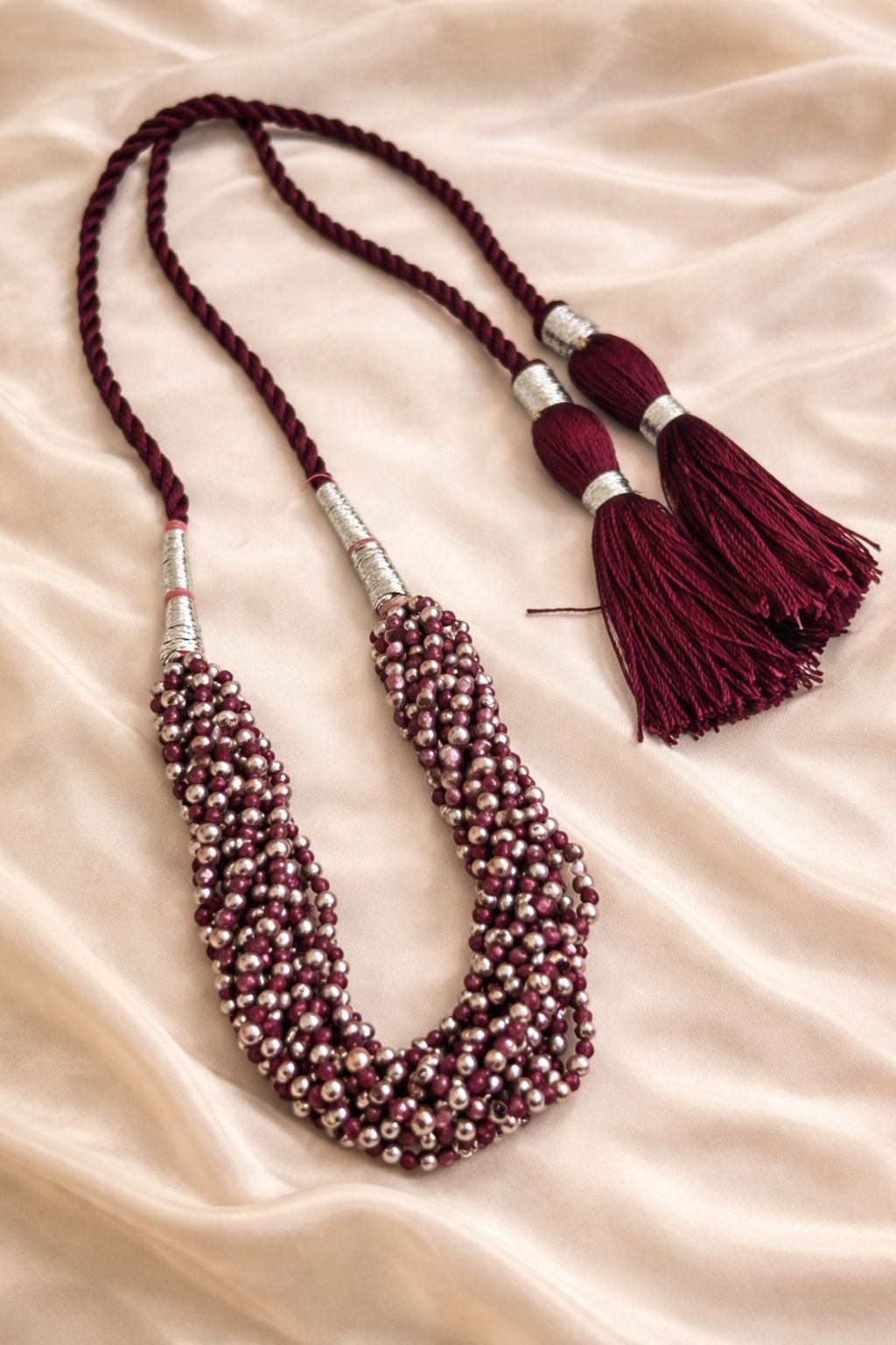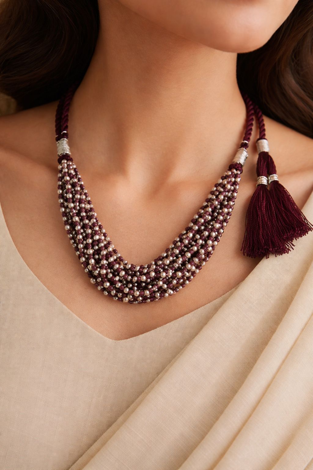 Handcrafted with natural freshwater pearls and accented with deep-hued rhodolite stone, this necklace brings together softness and strength in perfect harmony. The oxidized finish adds an old-world charm, while the rich pink-red tones of rhodolite lend quiet elegance.