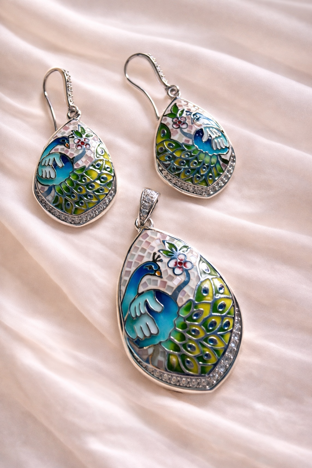 Peacock silver Enamel pendant set