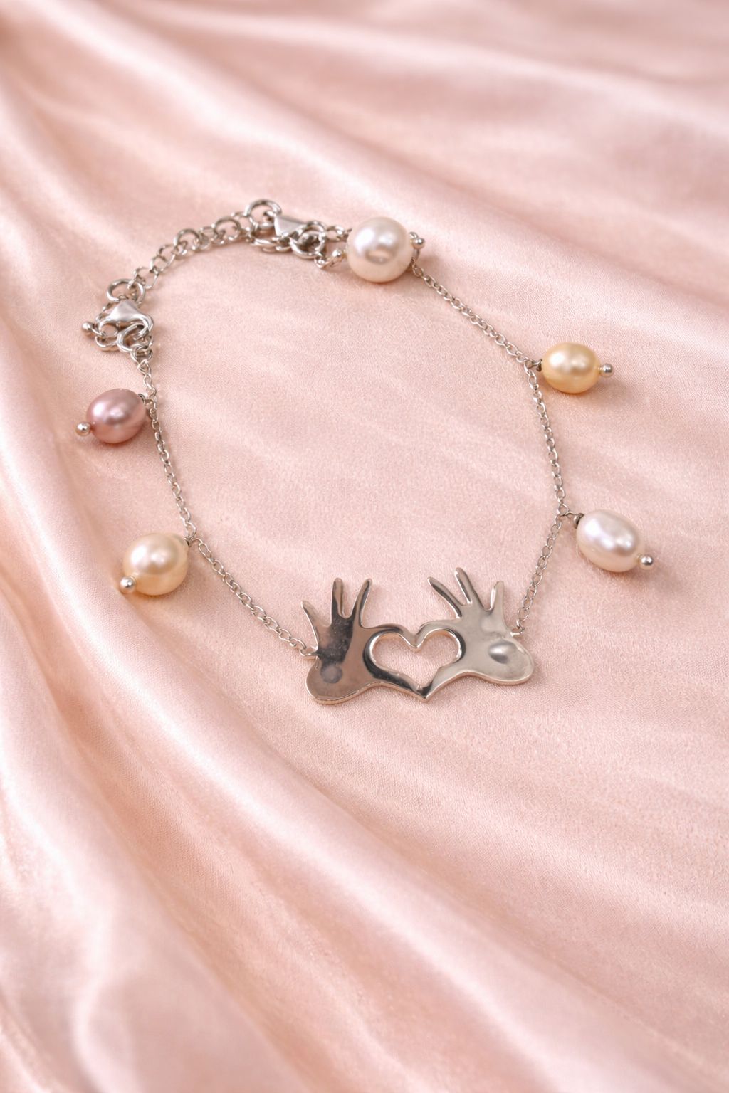 Home / Bracelet / Pearl Charm Silver Bracelet with Heart Hands Motif