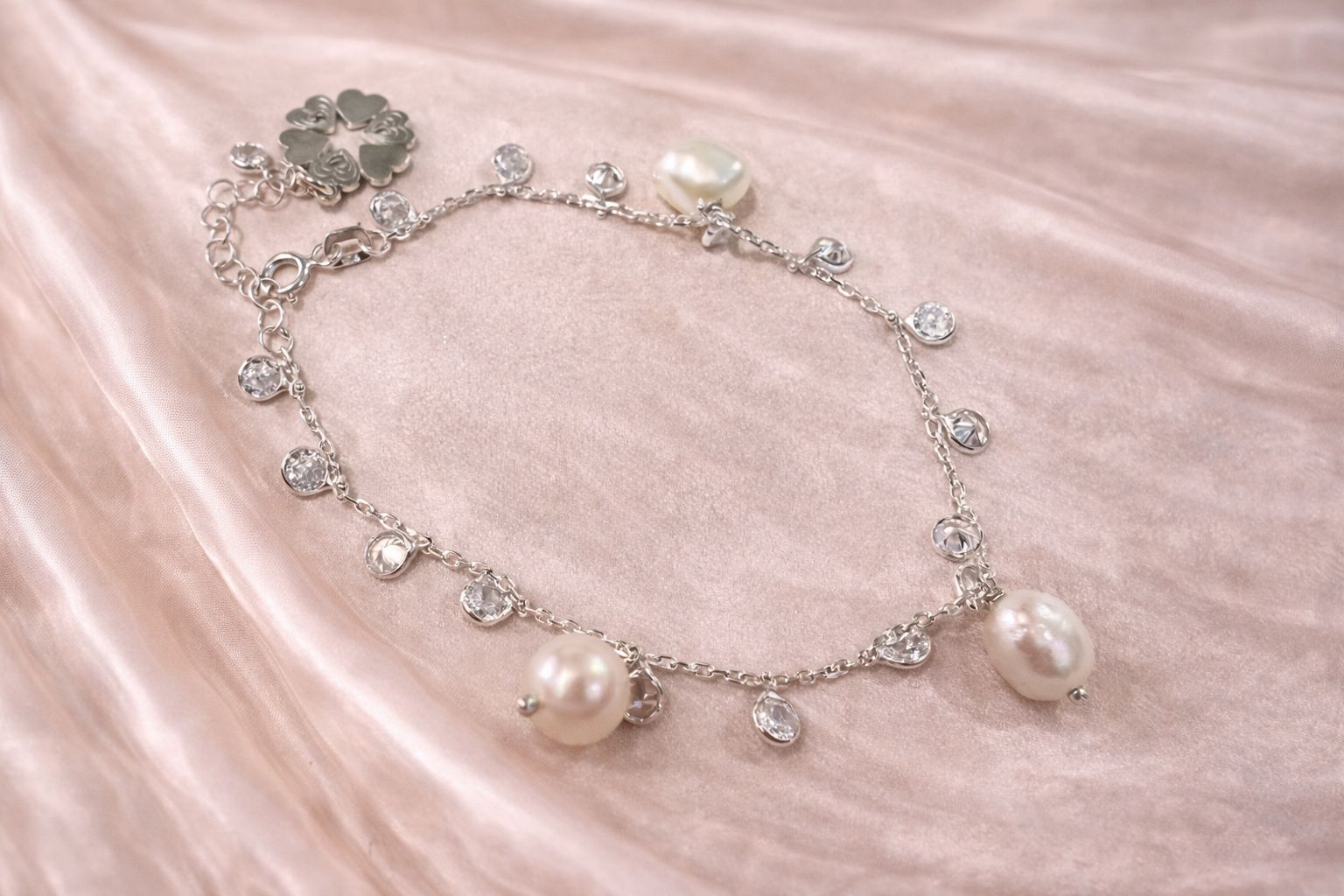A graceful pearl and CZ drop chain bracelet crafted in 925 sterling silver. Designed with sparkling CZ drops and two statement pearl hangings, this bracelet adds effortless shine and elegance to every look.
