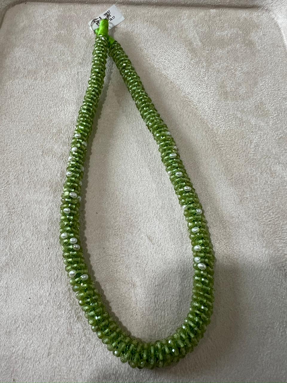 A refined peridot rope necklace designed with natural green peridot stones and delicate pearl accents. This handcrafted piece balances freshness and elegance, making it a timeless addition to your everyday and occasion jewellery collection.