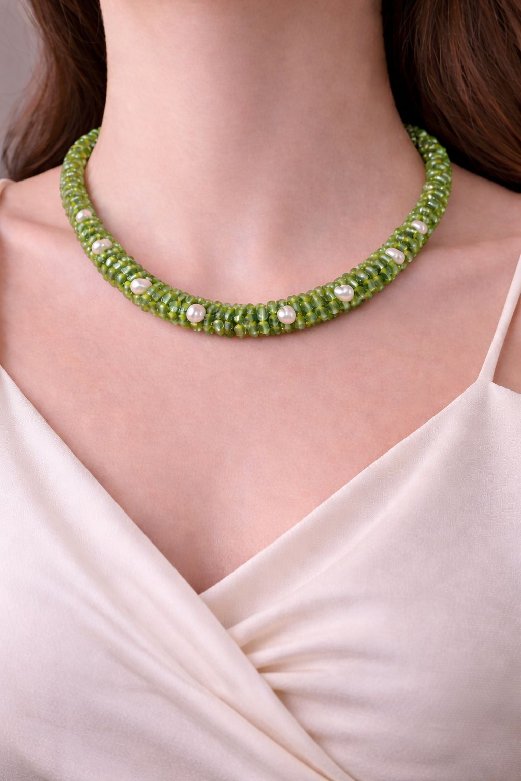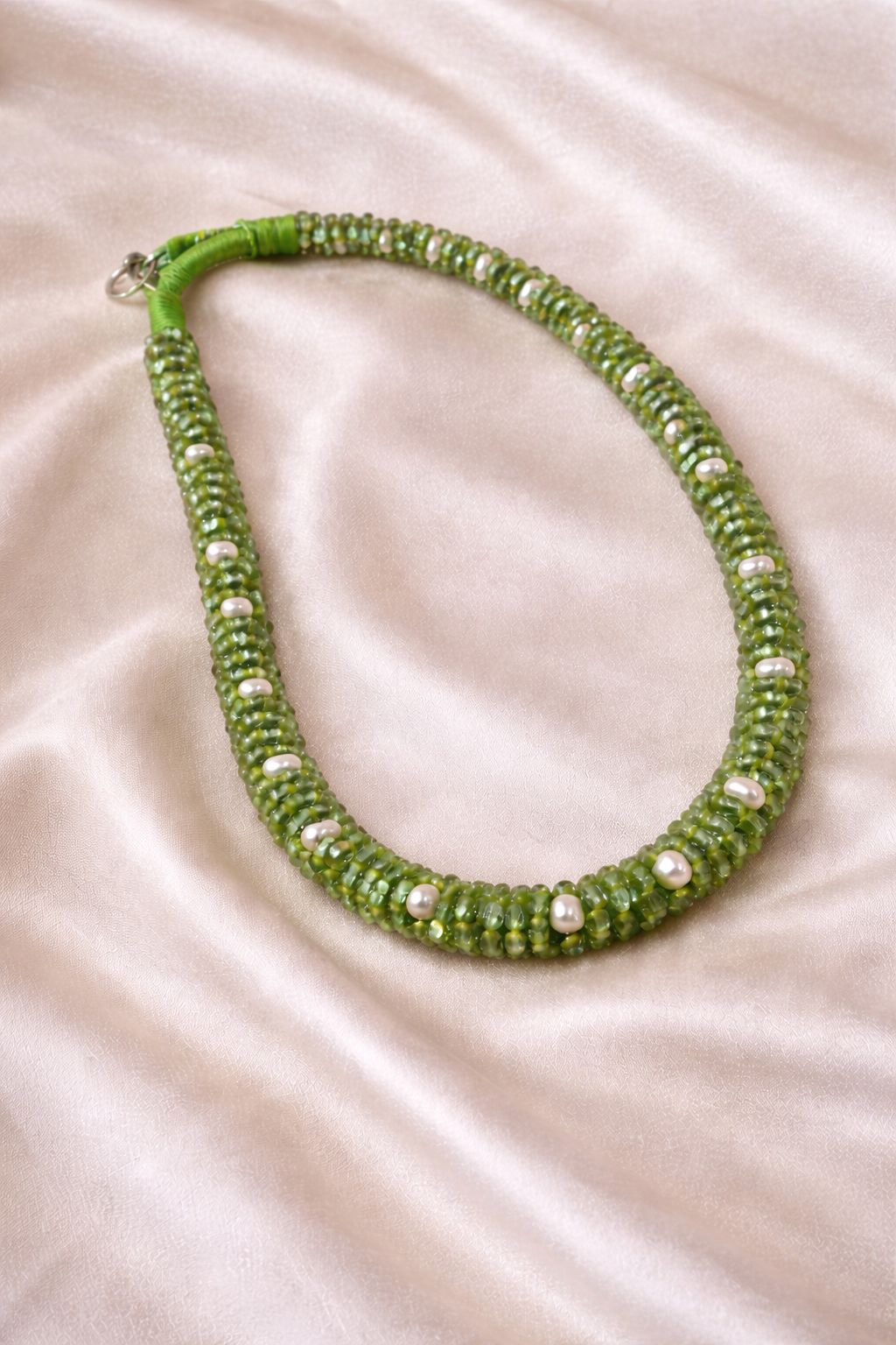 • Fresh green peridot tones with soft pearl highlights