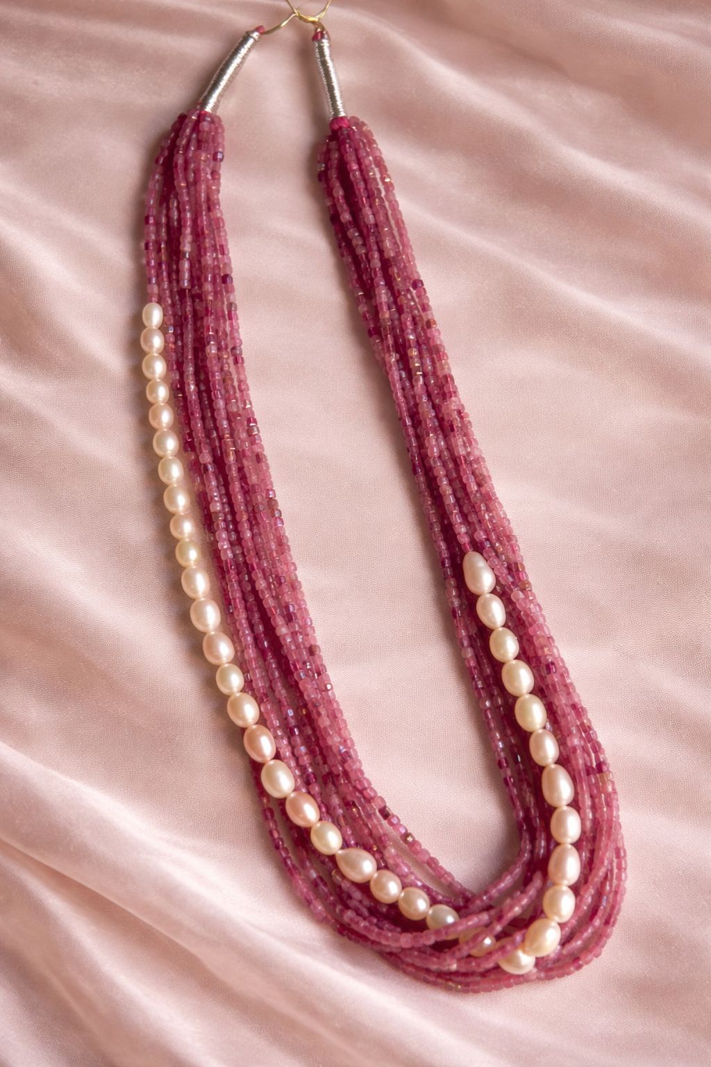 A stunning pink tourmaline multi-line necklace designed with layered gemstone strands and a graceful drop-pearl line. Finished with a secure silver lock and extension, this 19–20 inch statement piece brings effortless elegance to every occasion.