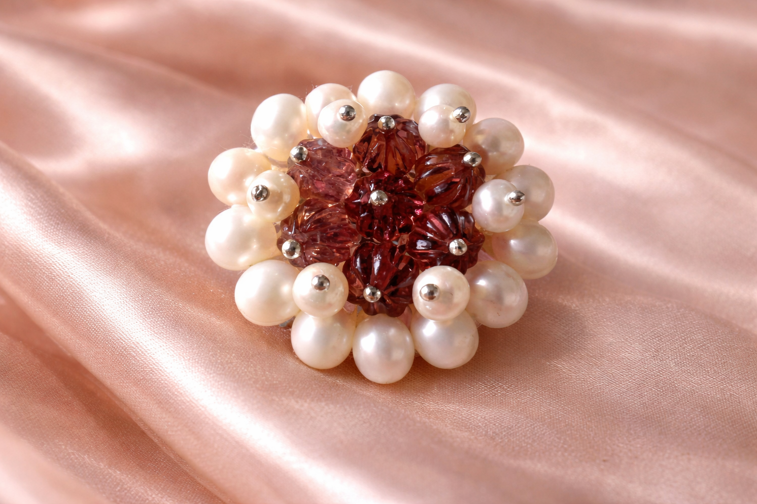 Delicate Pearl Accents: Delicate pearls surround or accent the Rodolite Garnet, adding a touch of classic elegance and subtle shimmer.