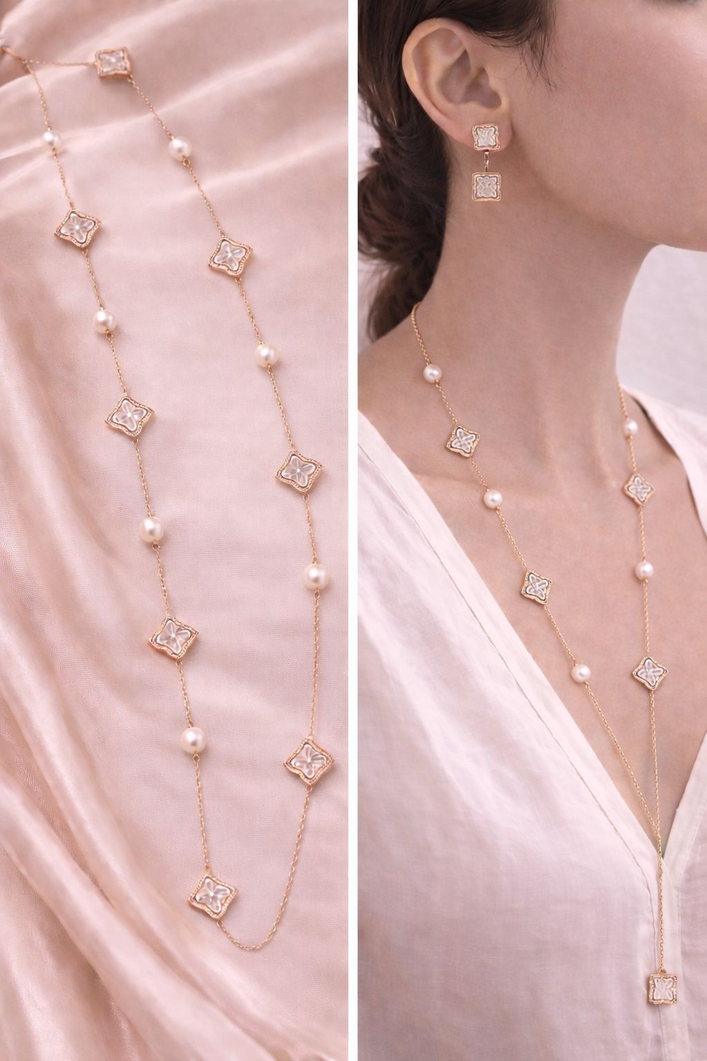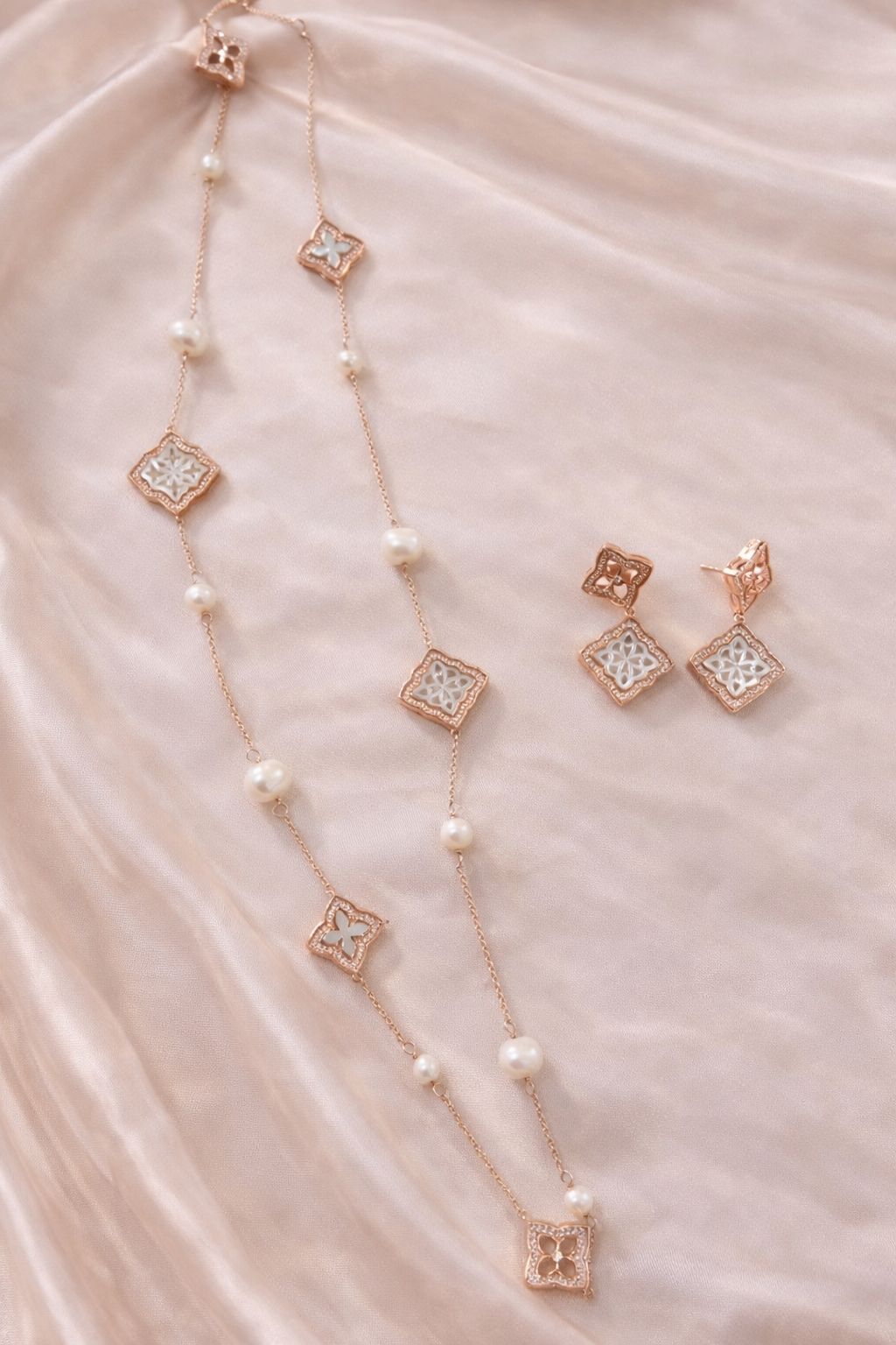 A stunning rose gold long chain necklace set crafted with carved Mother of Pearl plates and freshwater pearls. Designed in a 22-inch length with matching hanging earrings, this piece brings timeless luxury, softness, and statement elegance to every occasion.