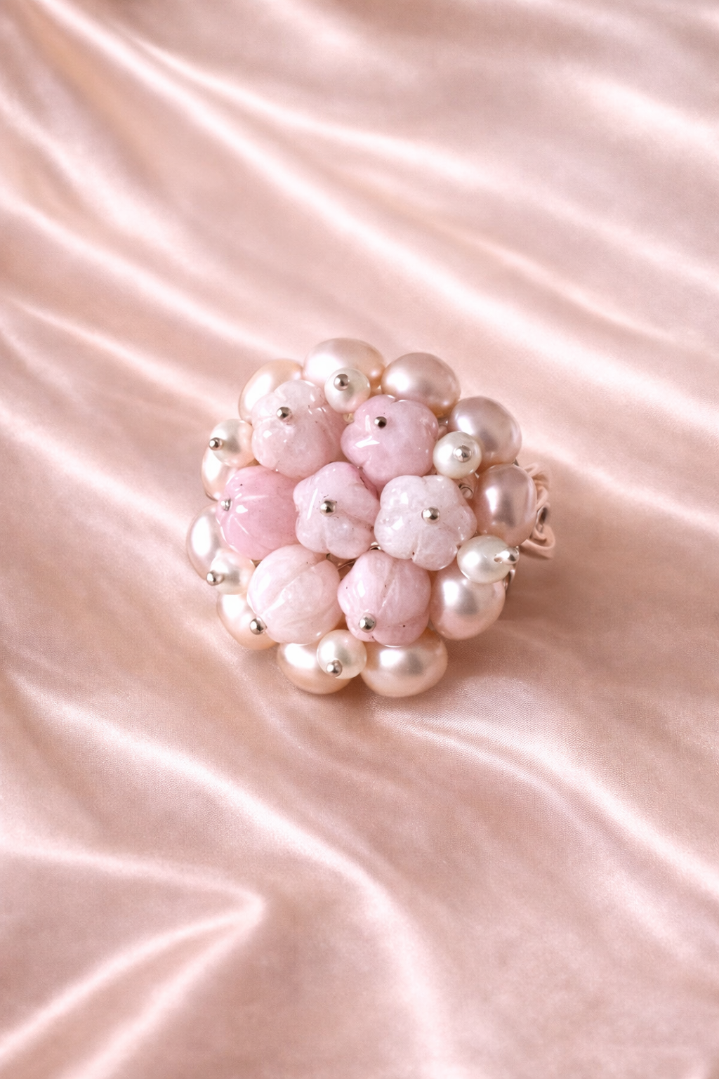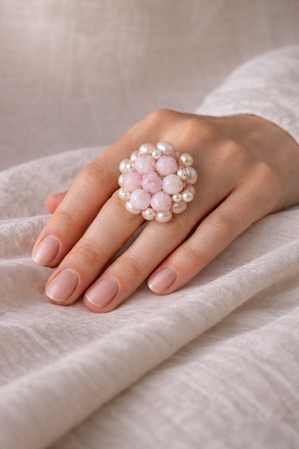 Classic Pink Pearls: Delicate pink pearls accent the Rose Quartz, adding a touch of timeless elegance and subtle shimmer. . The pearls enhance the overall feminine and romantic feel of the ring.