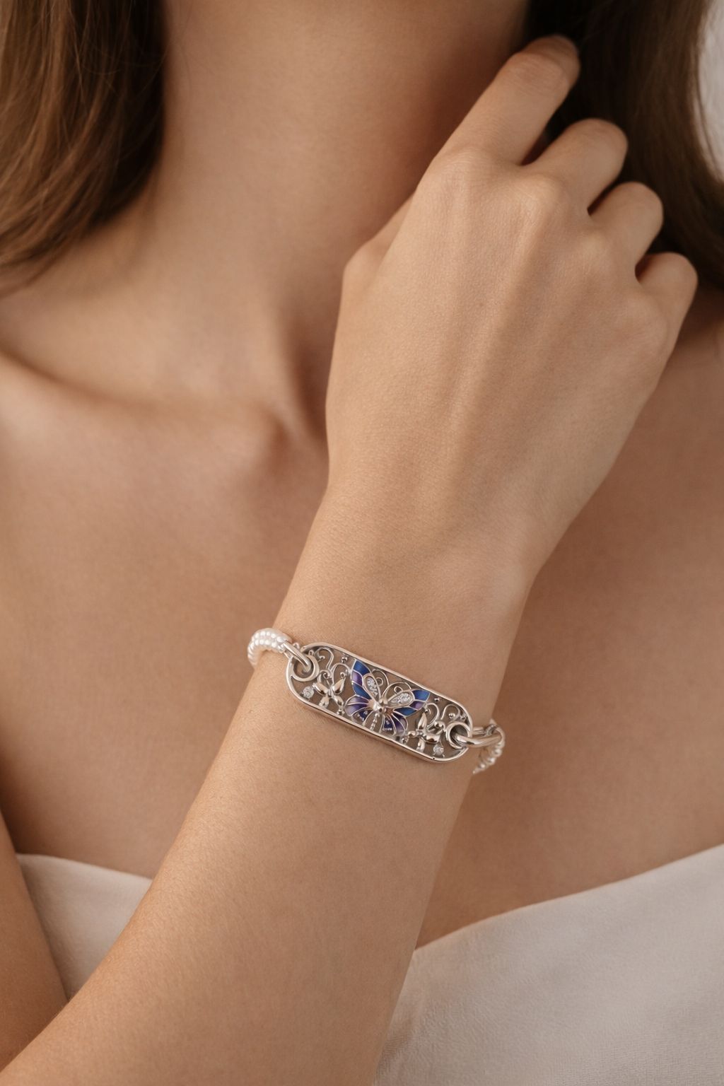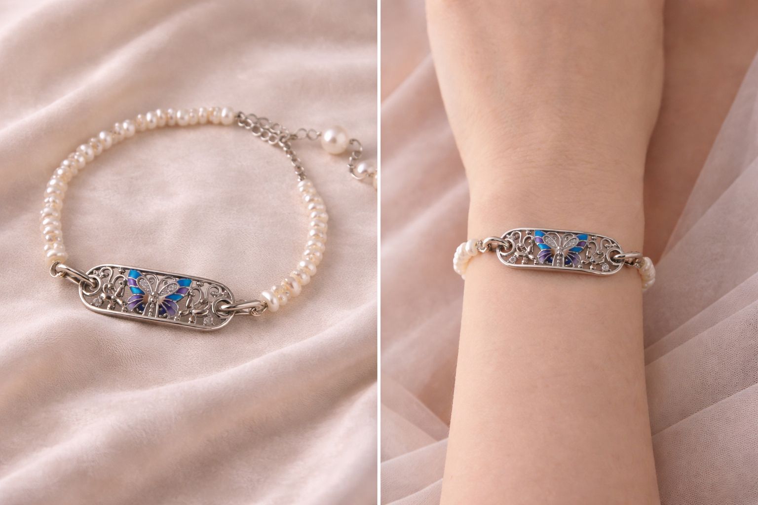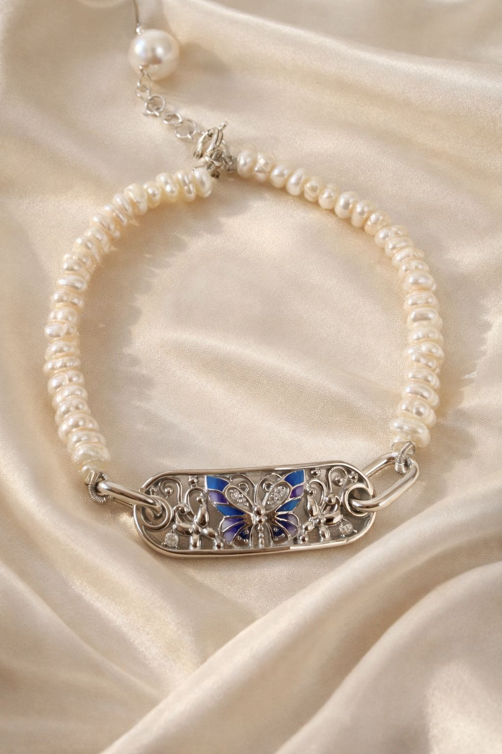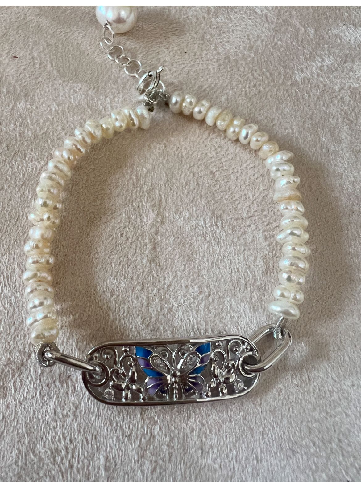 • Soft natural pearl lustre with a delicate silver butterfly motif