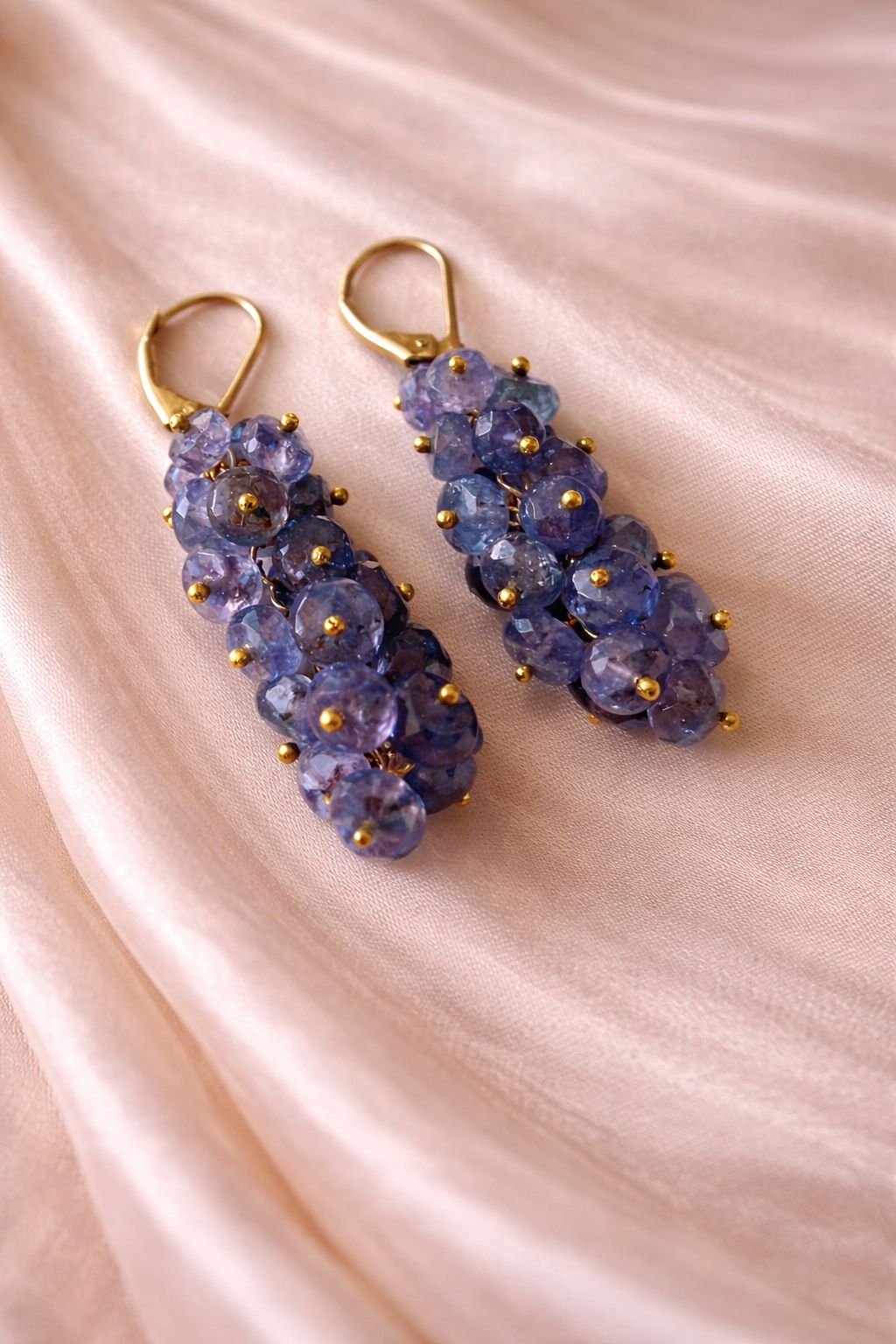 A stunning pair of tanzanite grape earrings crafted in gold-plated silver. Designed with button-shaped tanzanite stones in a grape-bunch cluster, these 2-inch statement earrings bring rich colour, elegance, and effortless glamour to every occasion.