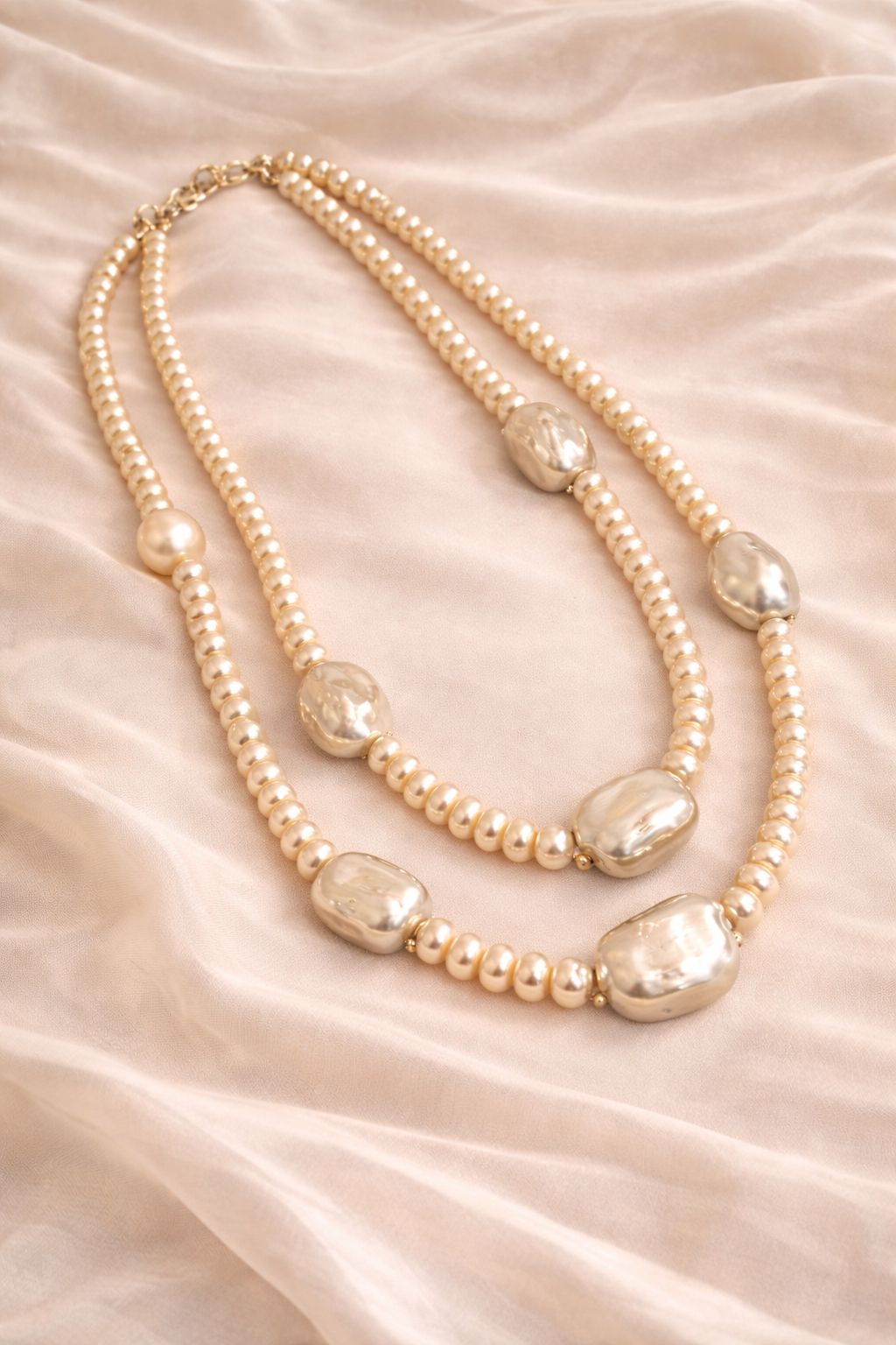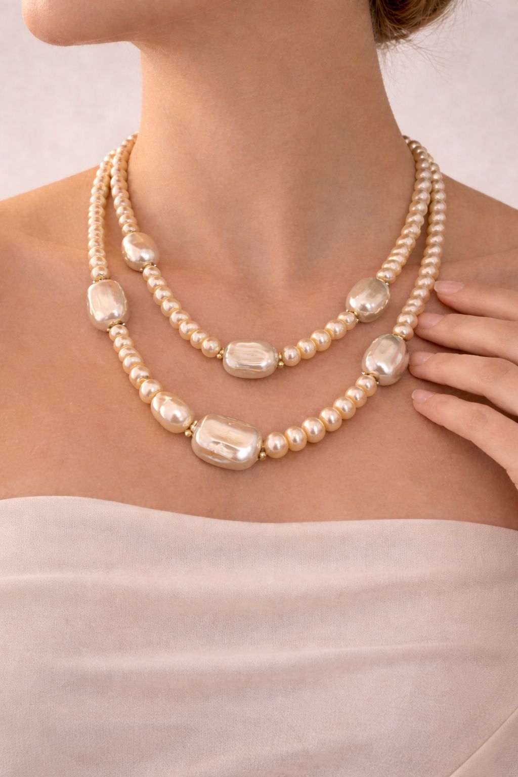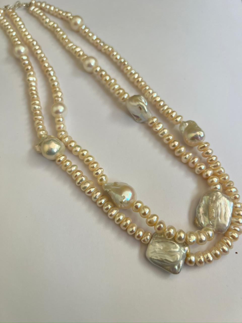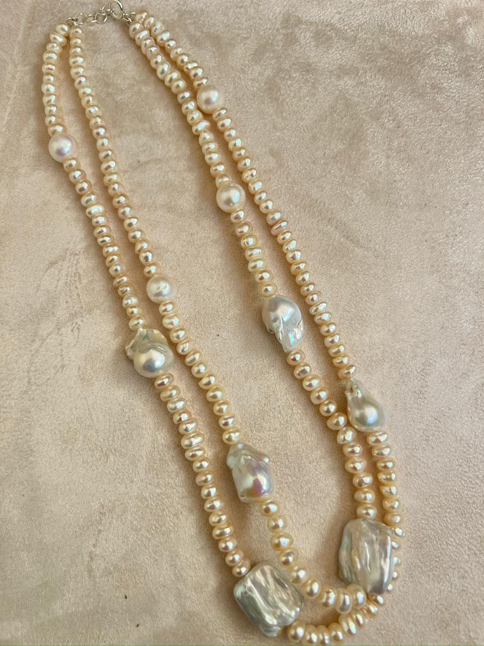 Elegant two-layer freshwater pearl necklace with square and organic baroque pearls. Handcrafted design with an 18–20 inch graceful fall.  A handcrafted two-layer freshwater pearl necklace featuring a mix of classic pearls and uniquely shaped baroque pearls, designed for an elegant and timeless look.